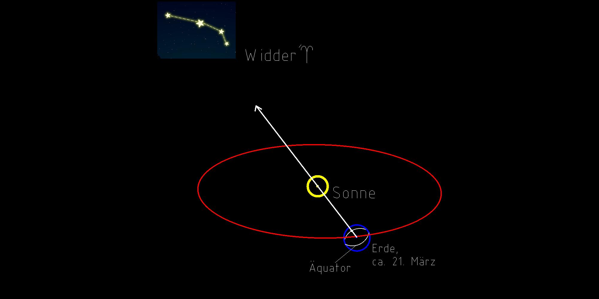 In weiterer Verlängerung zeigt die Gerade, quasi hinter der Sonne, z.Z. zum Sternzeichen Widder (engl. Aries).